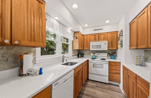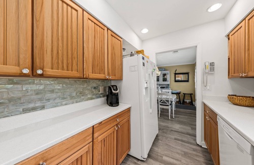 The cathedral ceiling in the living room with the large sliding door to the screened porch create a light, bright and open gathering place to enjoy the 55-inch HDTV. The first floor continues to include the open dining area with a table that seats six. The kitchen is fully equipped, (including Keurig and/or Mr. Coffee machines), for all your food prep and dining needs. Sip cool drinks on the large screened porch while watching the wildlife on the lagoon. Play a card game around the dining room table that seats 6, with an additional table for 4 downstairs.