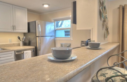 Living room has leather sofa, side table with lamp, large L.E.D. T.V. with sound-bar on a TV stand. House is light and bright with many large windows bringing in natural light. Windows have insulated room-darkening curtains or blinds (or both). Completely remodeled bathroom with new walk-in shower, “waterfall” faucet and ample towels provided, along with shampoo, conditioner, bodywash, and hand-soap. Washer/dryer available.