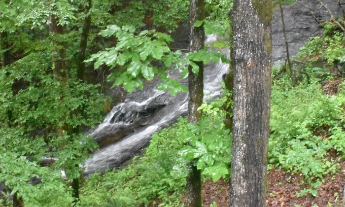 a very nice cabin with a beautiful water-falls 20 feet in front of you on the porch