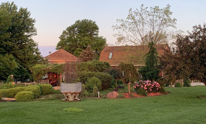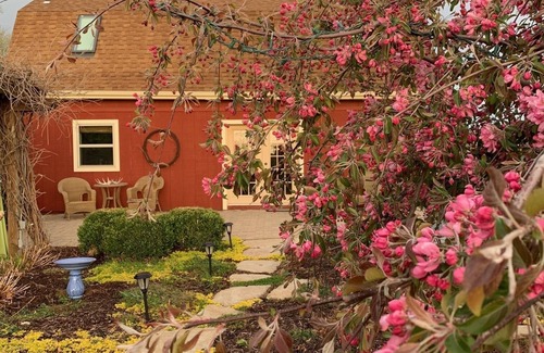 Our beautiful rustic barn has a stone gas fireplace perfect for snuggling and staying warm while you catch up on movie time or your favorite shows on direct tv. First floor also has a bathroom with shower, living room, eating area, and full kitchen that includes coffee maker, dishes, pots, pans, silverware etc.. The upstairs has2 bedrooms with 1 double and 1 queen bed in each room. A unique bathroom that has a vintage soaking tub . Also a sitting area where you can catch up on some reading or sip a glass of wine. We have Tvs with Direct TV in each bedroom .Enjoy the outdoor landscaping no matter what the season .Relax in a lounge chair outside under the pergola, throw a steak on the barbe, make some smores by the campfire, listen to the waterfalls, walk through the gardens and enjoy the sweet smells .