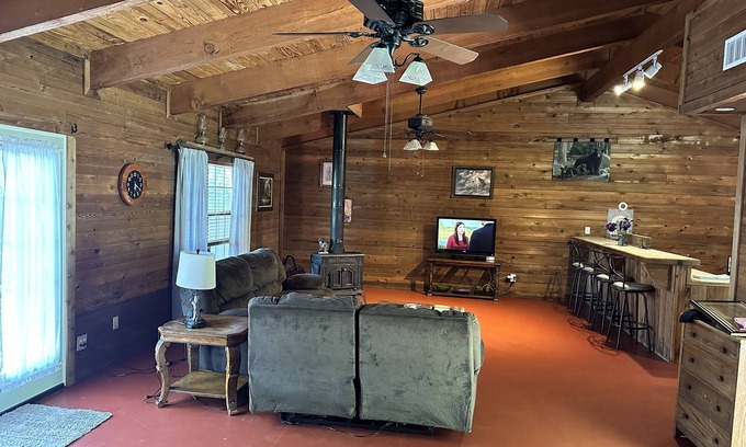 Spacious one room cabin with all the amenities of home. Reclining loveseat and couch, large screen television, with Ruko and WiFi, King size bed, nice bathroom with shower, kitchen with large bar, large closet. Really nice large patio with small grill.