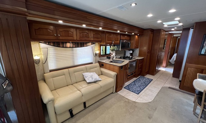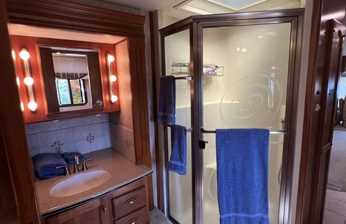Beautiful property quiet and minutes away from the city. Large RV space that's very luxurious. Full size shower and refrigerator. Setup outdoor space with cover and views. Large firepit area on the front of the property