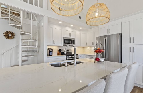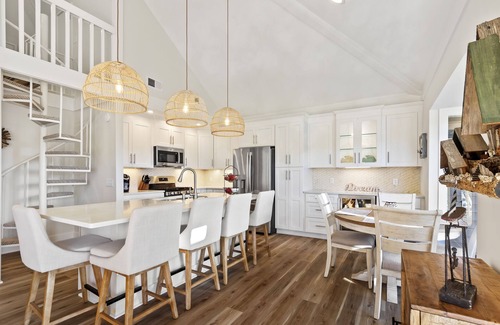 The fully equipped kitchen features new stainless-steel appliances with plenty of storage, including a separate beverage cooler, and under cabinet lighting. The stove is operated by propane. A Keurig coffer maker is provided. The quartz island features 5 comfortable bar stools for entertainment. The dining room table has seating for 4.