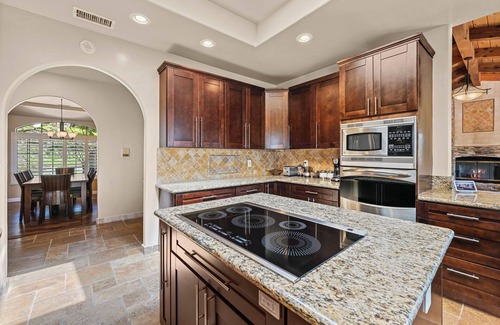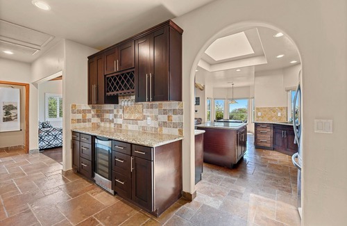 This spacious single-story home features three luxurious bedrooms and three full baths, accommodating up to 16 guests comfortably. The heart of the house lies in the chef-inspired kitchen with high-end stainless steel appliances and stunning granite countertops, perfect for culinary delights during your wedding festivities. Guests will enjoy gathering in the large family room adorned with a stone fireplace and cathedral ceilings or relaxing on the covered patio surrounded by scenic vistas. Additionally, the property is equipped with state-of-the-art security, ensuring peace of mind as you celebrate your union in complete privacy.