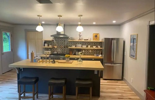 At the heart of this house stand a beautiful and inviting open format kitchen with floating shelves, Butcher block counter tops, and wood flooring. The kitchen is fully equipped with a stainless steal refrigerator, dishwasher, microwave, toaster, coffee maker, breakfast bar and range oven. Enjoy your meals together at the farmhouse table with seating for the whole family or at the beautiful breakfast bar over looking the kitchen.
