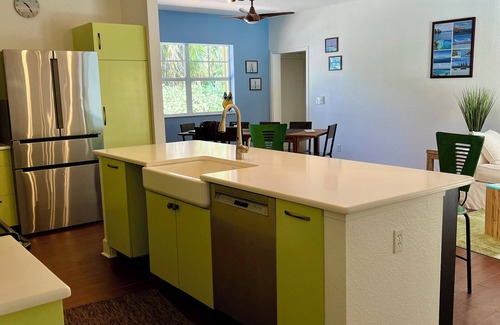 Welcome in our huge 2 bedroom 2 bathroom home. The entire house is fitted with modern coastal decor & equipped for long stays. Relax around the pool/patio or enjoy nature in the wooded backyard. Very quiet, private & unique environment. Includes a spacious family room that opens up to a full kitchen & dining room, with pool view & courtyard view. Additionally there is a Queen Fold Out Sofa in the Lounge that sleeps 2 extra guests. On the premises sits an entirely independent 1/1 Casita guesthouse rented separately.