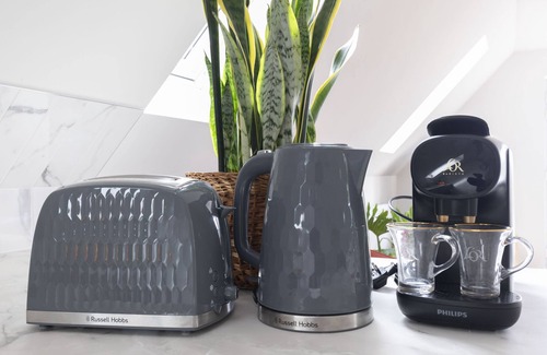 Upstairs, the space opens into a bright and airy open-plan living, kitchen, and bedroom area. The fully equipped kitchen has everything you need to cook and dine in style on it's breakfast bar, while the king-size bed invites restful nights.