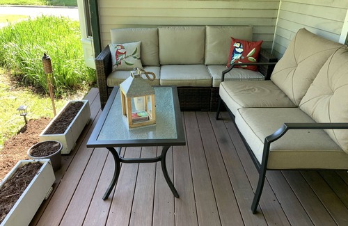 Off the kitchen is a deck with outdoor seating, a picnic table, gas grill and a small garden. The front yard is a sunny place to hang out on the Adirondack chairs.