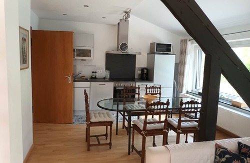 The newly renovated apartment is located on the first floor and is on 110 m² very nice and fully furnished. You have a beautiful view of the large garden. The apartment has a hallway with wardrobe and sofa, bathroom, bedroom, living room with sofa bed, dining area and full kitchenette with dishwasher. The apartment has another mansard or Gallery (bedroom 2 beds) and a Parisian balcony. Furthermore, a Teilgartenmitbenutzung a small meadow side of the house with seating area and charcoal grill.