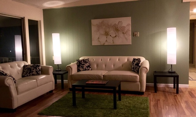 Newest upgrades: A brand new, energy efficient air conditioner now cools the living room. The unit also works as a heater for cool winter evenings. Scraped wood style Pergo Applewood flooring has been extended down the hallway and throughout the master bedroom. A beautiful matte gray Pergo Montage Gray wood floor now greets you in the hall bedroom/office. Hickory Greige Twist luxury vinyl plank flooring in a modern dark mocha color updates the hall bathroom and kitchen. A Kwikset high tech touch screen deadbolt lock in antique bronze controls access to the home. Bright Minka Lavery LED light fixtures give a modern touch to the two bathrooms. Crestwood balcony height table with sling back chairs now adorn the outdoor dining area on the patio. A Sony stereo system with Focal Sib bookshelf speakers on stands has been added to the 55" big screen Smart TV in the living room, for a home theater experience. A new microwave oven and Kohler luxury oil rubbed bronze pull down kitchen faucet were recently added for your enjoyment. A Monterrey oil rubbed bronze light fixture with six dimmer controlled Edison bulbs control the ambience the dining area. A luxury single handle Grohe Tallinn bathroom faucet in Starlight Chrome adds elegance to the master bathroom. The hall bathroom faucet was upgraded to a BWE single handle waterfall faucet - the kind that allows water to run off the spout. We also added two matching chairs with ottomans in the living room. A new white leather couch and loveseat have also been added to the living room.