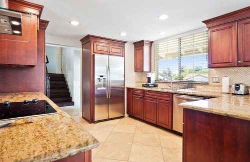 Newly renovated split level home with 3 bedrooms, 2 1/2 baths and solar energy, located in a picturesque neighborhood with rolling hills and a front view of the nearby private golf course. Backyard has 2 covered patios, a gas grill, hot tub, putting green, and a basketball area. Spacious bedrooms with Temperpedic mattresses and each has its own TV. Kitchen is fully equipped, large living spaces with an indoor fireplace. Centrally located to shopping, beaches, Disneyland, Legoland and more!