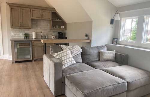 Apartment style loft about the garage includes one bedroom, full bath, plus living space with sectional, tv, and kitchenette