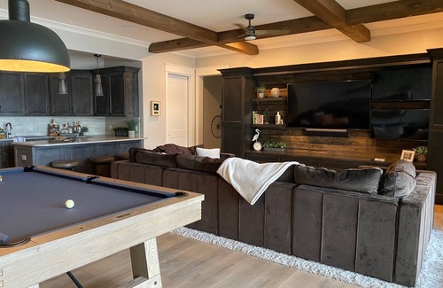 Lower level great room with bar, pool table, and 3 TV Media Center connected to walk out patio down to the beautiful pool and hottub and lake.