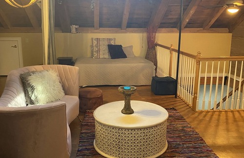 Unwind and luxuriate in this serene, fashionable haven, adorned with captivating 20-foot ceilings, rustic brick walls, exquisite artwork, and deluxe decor. The generous 800-square-foot loft effortlessly accommodates up to four guests, ensuring a comfortable and memorable experience. A private, fully equipped bathroom, along with ample storage space to keep your belongings organized during your brief stay.