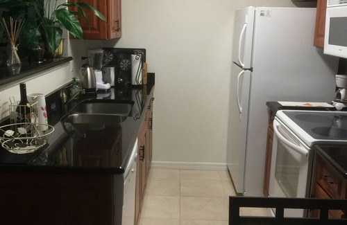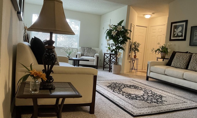 A luxury immaculate condo, stylishly furnished and well equipped. Everything in this condo is excellent quality. Beautiful views of lake with fountain. Tropical landscaping. Second floor, all rooms overlook lovely lake with fountain, surrounded by trees, palms and tropical plants. Quiet position yet close to all amenities. Unit comprises nicely furnished spacious living room with separate dining area. Large master bedroom with queen bed (very comfortable with pocket springs), Smart TV in bedroom with Roku channels, remodeled en suite bathroom with bathtub and shower over, very large walk in closet. Upgraded well equipped kitchen with granite counters. Range with ceramic top, fridge, dishwasher, microwave. Coffee maker, blender, kettle, toaster. Large full second bathroom with bathtub and shower over, remodeled. NOTE: Bed 2 is furnished as den/media room. This is an ADDITIONAL sitting room/study/TV room with computer desk and sofa. A very relaxing room with lovely view. New smart TV with Roku channels.. Laundry room with full size washer and dryer. Lots of closet space in condo. Attached private sitting area overlooking lake and fountain under cover. Relax whilst you listen to the fountain! Utilities, smart TV, wifi internet included. Car port. Venetian Palms is an attractive site, with tropical landscaping and lakes with fountains. There are numerous facilities, including two lovely heated pools, (one very close to condo), and hot tub with jacuzzi, sauna, tennis, paddle ball and volley ball courts, fitness room. Social events organised. Excellent location, in quiet position but very close to the main road 41, where there are numerous dining options and shops. Some shops and restaurants within walking distance. 20 minutes to beaches, 20 minutes to airport. Very popular. Visitors return to Venetian Palms year after year.