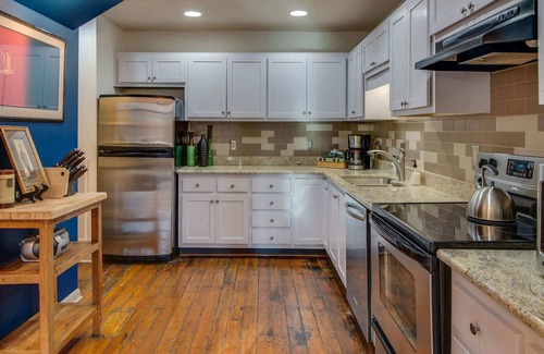 This bright and inviting Nashville Riverfront loft is designed for comfort and entertainment. Challenge friends to a game of pool, enjoy a meal at the dining table for six, or unwind in the cozy living area with a Smart TV. After a night out, retreat to a private bedroom with room-darkening shades for a restful sleep.