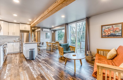 Beautifully positioned in downtown Cascade Locks with views of the surrounding Columbia River Gorge, this modern, two-bedroom home will place the Pacific Crest Trail, the Historic Columbia River Highway, and the Bridge of the Gods right at your fingertips. Newly constructed from a storage container, this home is a contemporary, light-filled space, with electric heating and cooling, a Smart TV with Netflix and Pandora, and an open, elegant kitchen with stainless steel appliances and sleek cabinetry. Whether you're planning to spend your days hiking, windsurfing, or taking long drives through the Gorge, this is a wonderful place to come home to, with a kitchen island where you can set out your appetizers and a separate sun-lit dining table for homemade dinners.