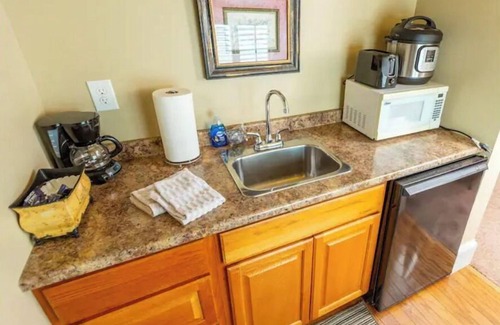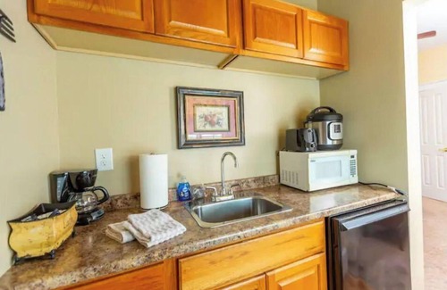This suite has a Queen-size bed with custom-made bedding and window treatments. A kitchenette with Instapot for cooking, and living area with desk. Large master bath with walk in shower.
