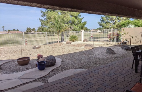 Excellent location on a tropical quiet cul-de-sac within blocks of Ironwood Country Club and Golf Course, with Oakwood Country Club just a short 10 minute jaunt by golf cart. This 2 bedroom 2 bathroom, plus office Sun Lakes home sleeps 6 and includes a Golf Cart and many other amenities. Settled on the Ironwood golf course within a quiet age-restricted community (ages 40+), this property is ideal for you and your friends looking to escape the winter harshness. Amenities at the house include flat screen TVs with internet and Youtube TV streaming service, a fully equipped kitchen, a gas BBQ grill and outdoor furniture. The master bedroom has a king size bed, an HDTV, a view of the golf course and access to the backyard patio. The 2nd bedroom has a queen size bed, a large walk-in closet, and an HDTV. The 3rd bedroom/office has a sofa sleeper and a desk. Linens are provided for beds and bath. Keep in touch with your family and friends via the Internet and enjoy your favorite shows via Google streaming devices. A washer and dryer are provided for your convenience. Enjoy your favorite team on one of the big screen TV's at the clubhouse, play 18 holes of golf or soak up some sun while relaxing in the Club's heated pool or spa. In addition, guests of Sun Lakes have access to all 5 Sun Lakes communities and club houses, which are accessible by golf cart, restrictions apply. Facilities available include golf, tennis, pickle ball, fitness center, adult resort pool, lap pool, excellent restaurants and many social clubs. If you haven't tried pickle ball, it's a lot of fun and good exercise. Only monthly rentals are accepted. No smoking allowed.