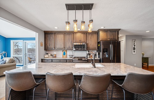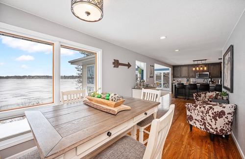 Make yourself at home in this tranquil retreat away from home. The main floor features an inviting open layout, ideal for bringing together friends and family. Adjacent to the kitchen, discover a delightful sunroom offering the perfect spot to capture the morning sun's rays. The master bedroom is a haven, featuring a king-sized bed, walk-in closet, and a 3/4 master bath with a double vanity. On the main floor, you'll also find a full bath, convenient laundry facilities, and an additional bedroom. Venture downstairs to the basement, where a full kitchen, living area, 3/4 bath, and another laundry room await. The basement opens up to the backyard, creating a seamless connection with the outdoors. The backyard is a haven for outdoor activities, providing an ideal space for yard games. There is a patio overlooking the lake with gas firepit. One basement bedroom boasts a king bed, while the other offers a queen bed. Enjoy the amenities of the yard, including games, a fire pit, a gas grill, a Blackstone grill, and a professional ice maker. Welcome to your home away from home oasis.