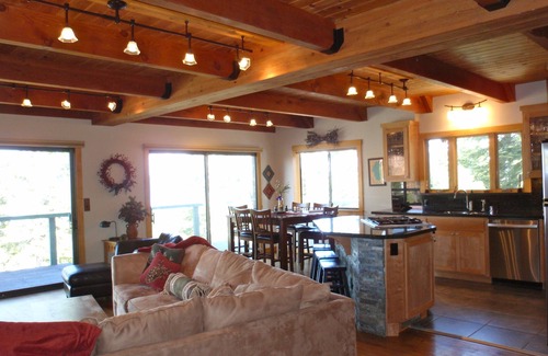 You can view Lake Tahoe from the living room, both decks, Master Bedroom, Bear bedroom, and both bathrooms. Cook dinner at the kitchen island, while looking at the lake, visiting with friends seated around the island, see the fire burning in the fireplace, and watching the big screen high definition TV – all at the same time. Enjoy meals or cocktails looking at the lake, from inside on the couch or sitting outside on the deck. In summer and spring, look at the lake while you relax from the hammock. Walk out the door and you’re hiking in National Forest. Meeks Bay Resort is a five-minute car ride away. It has a white sandy beach, kayak, and snack bar. Opposite the beach, there is access to Desolation Wilderness & hiking trails.