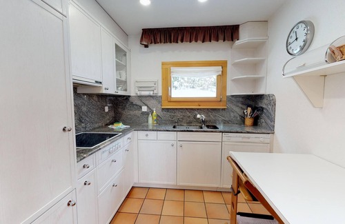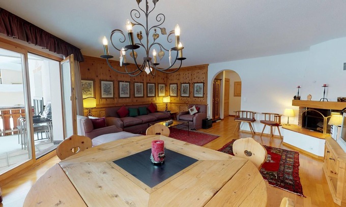 Beautiful three-room apartment on the first floor with approx. 100 m2. Entrance with hall stand. Large living room with corner sofa. Fireplace is unfortunately not usable. Dining area with beautiful free view on the mountains with access to the roofed terrace. Swisscom TV, radio, Wi-Fi. Spacious separate kitchen with oven, dishwasher, microwave, refrigerator and separate freezer. Accessories for fondue and raclette are available. A double room with 2 mattresses (2x90x190). Bathroom/WC/sink. Bedroom with three single beds with shower, WC, sink. Comfortable furnishings. A parking space in the garage. Shared ski- and washroom. Non-smoking apartment. Pets are not allowed.