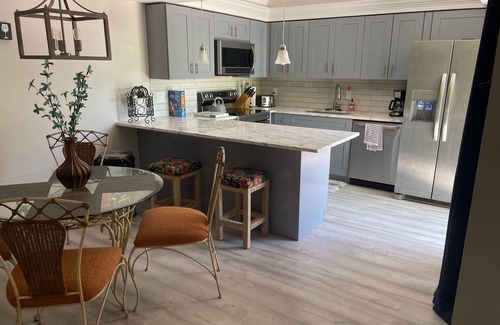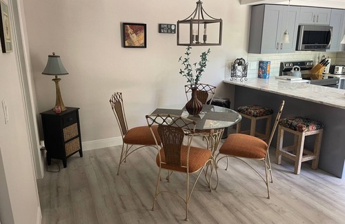 Highlights include: Private Fenced Courtyard with grill, Private key entry heated swimming pool, (2) reserved (marked unit 3) parking spots right in front of this gorgeous property. Wide plank grey hardwood floors throughout the property. Designer Tile Floors in both Baths, a Custom Shiplap with Faux Electric Fireplace, A/C and Ceiling Fans throughout. The Kitchen features a Custom Built Tray Ceiling with 2 Pendants, LED Rope Lighting, Grey Blue Shaker Cabinets w/Crown molding, Quartz Counters, New Appliances and Subway Backsplash. If you have to do a little work while traveling enjoy a glass desk, super fast FREE 600 Mb speed Internet, comfortable chair, and white board.