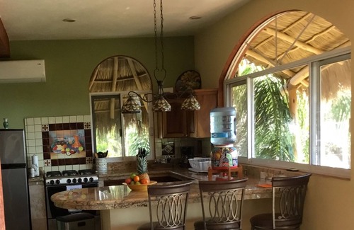 This is a Beautiful 2 bedroom, 2 bathroom house with ocean views on one side and mountain views on the other side. Studio like floor plan with two bathrooms, laundry, and the top floor is a palapa roof patio with a bar. Marble and granite throuhgout the house, lots of parking inside a gate as well as street parking. Only a five minute walk to public transportation, lots of restaurants only a 10 minute walk to enjoy a variety of Mexican cuisine. A View of the World class Marina. Come enjoy the Mexican paradise while you sip your coffee and watch whales from the comfort of home.