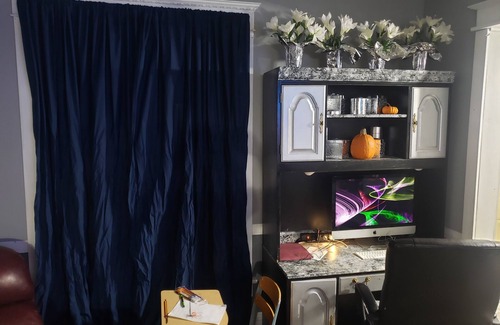 There is a nice large deck and grill on it. 72 inch screen tv in the livingroom. There is also a tv in the Queen bed room. They both use Chromecast so you can cast what you are seeing/watching on your computer/laptop to the tv such as youtube, netflix, or disneyplus or just your computer screen.