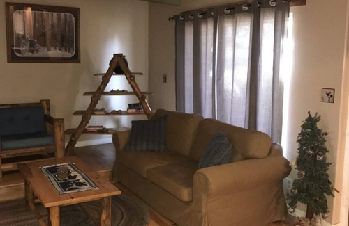 The living room contains a queen-size futon sofa, and our gas stove fireplace will keep you warm on a cold winter evening. Pine-log furniture and hickory hardwood floors throughout add to the warm and cozy atmosphere. The cottage is complete with TV/DVD and satellite television.