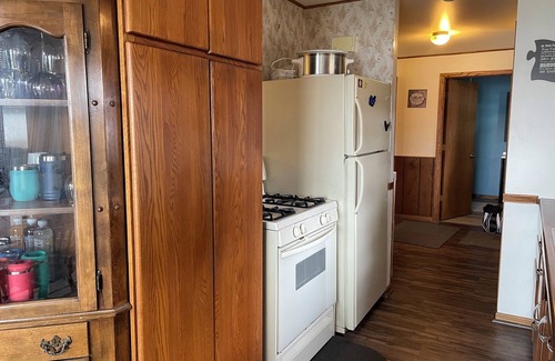 1st level has fully stocked kitchen including fridge, stove, oven, microwave, toaster oven and Keurig machine(bring your own cups). Open area with kitchen(cut out window), dining room and living room all together. Dining room table has 6 chairs that can sit around it or sit outside on the patio to eat. Nice big living room for plenty of seating to watch tv/movies or play games. LR also has a wood burning fire place to nestle up to in winter.