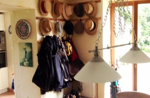 However, the view from the kitchen window over the cornfield to hills beyond ensures that even time at the sink can be a pleasure. Beyond the pretty bread oven at the back of the kitchen is the suitably large utility room where guests will find a freezer, washing machine and tumble dryer. The dining area leads into the lovely lounge where all guests can relax and make use of the ample books and games that are available or just sit and watch the television. There is also a DVD player. If visiting outside of the summer season it’s possible to use the wood burning fire which will ensure days and evenings remain warm and cosy. The downstairs double bedroom is situated at the back of the lounge and has an en-suite shower, bath, sink and toilet. There is also a walk-in wardrobe. The room has the added benefit of having French doors that open directly onto the courtyard.