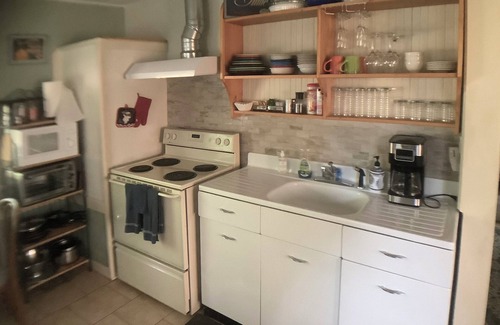 Cabin 1 is loacated in front of the main lodge. It was the original carriage house. Now it is a lake front cabin built in the 1912 it shares a 2 acre lot with historic Point Comfort Lodge. Recently remodeled rustic style cabin it has 2 bedrooms. One large bedroom with lake view has a king size bed and 2nd bedroom has a small twin bed, closet for clothes and a lake view. Maximum number of persons in this cabin is three. This building was the original carriage house for Point Comfort Lodge. The kitchen is fully stocked with everything needed to cook. Coffee maker, blender, pots/pans/baking dishes etc. Kitchen table with 4 chairs. Lake view from living room. Small private lawn area outside bedroom and living room windows. patio chairs available. Shared Gas BBQ. Charcoal BBQ's are not allowed in the area during fire season. Please visit our blog for more pictures. HTML address is located in the links area of this web site.