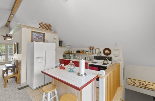 Our classic comfortable home on 1.7 acres nestled among mature trees and green grass will give you that away from the city feel. It sits on the water, in a private cove. The open living area and nice screened in porch gives room for comfort away from the elements. If you are looking to stretch your legs this is the place for you. the Roadhouse boasts amazing outdoor spaces and room to roam. The fully equipped kitchen and outdoor kitchen are exactly what you need for no-fuss cooking. A full bathroom sits between two bedrooms each with queen beds on the first floor. Upstairs, the Master loft has a king-size bed and private en-suite with a walk-in closet and freestanding tub. There is a futon in the living room for another sleeping option. For more than 5-6 people - the Guesthouse Hideaway is available for a fee and has mini kitchen with refrigerator, microwave, and full-sized stove, 1 king bed, 1 queen bed, and another futon for additional options. The Hideaway also boasts a full bathroom, this area is great for teen retreat or extended family who prefer a little privacy. Both areas sleep 12-14 comfortably. We have a beautiful garden that is usually blooming with seasonal vegetables. Fishing is fun and easy from the dock on the private cove. Standup Paddleboard, canoe and kayaks available at no extra fee. A nice fire-pit area for relaxing, roasting marsh mellows, or even cooking on the commercial open pit with grill grated firewood also provided.