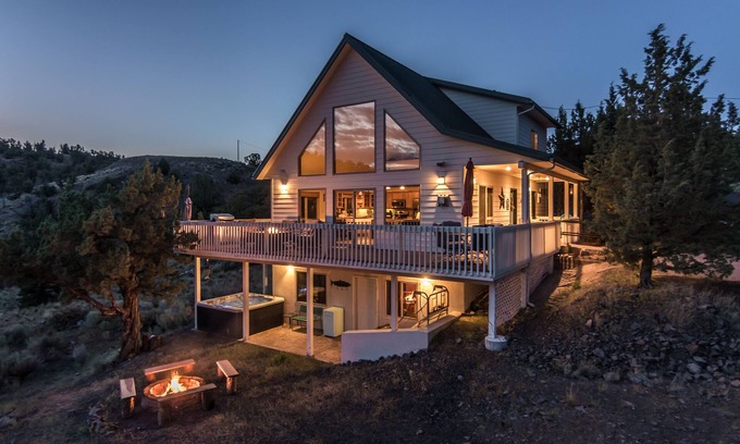 From the moment you round the first curve and see the water of Prineville Reservoir to the moment you round the final curve and see the expansive windows and wrap around deck to finally walking through the front door of the Juniper Ridge Retreat, you know you just started your memory making vacation in this really cool, well equipped, and tastefully decorated mountain chalet overlooking the Prineville Reservoir. This home will sleep 10 adults with Master Bedroom king bed, 2nd Bedroom king bed, 3rd bedroom 2 sets of bunk beds and trundle bed, Loft area Sleeper sofa. There is a single mattress and a single fold out bed but not listed as adult sleeping beds/areas. Home features a well stocked kitchen, extra coffee station downstairs, air hockey table, basketball hoop game, stereo system, dish network, internet, TV, TV/DVD players in Master, 2nd Bedroom, and Loft area. The home is wired with speakers in the loft, great room, and outdoor deck area. There are lake/mountain views from almost every window in the home. The wrap around deck features a propane fire pit, a patio tabl ,BBQ, and two loungers. There is also a set of binoculars to catch a closer view of the deer, bald eagles, and other numerous wildlife. There is a cozy 6-7 person hot tub and a wood burning fire pit off the downstairs patio. These are the best skies for stargazing, and there is a star party every year at nearby Prineville State Park. The quiet crisp Juniper scented air is absolutely soul restoring! The views of the lake and surrounding mountains are captivating. The night sky is clearer and deeper and feels like you are inside the universe. There is definitely something special about this area, and the Juniper Ridge Retreat makes you feel right at home. Less than half a mile down the road is Jasper Point State Park Boat Launch with the marina and store with boat rentals and more a little further beyond that. When you're not enjoying the reservoir or hiking, nearby historic Prineville has some fun shops, great eats, and friendly folk everywhere you go. WIFI and cell phones not reliable due to remote location. Copy and paste link below to see the 3D tour.