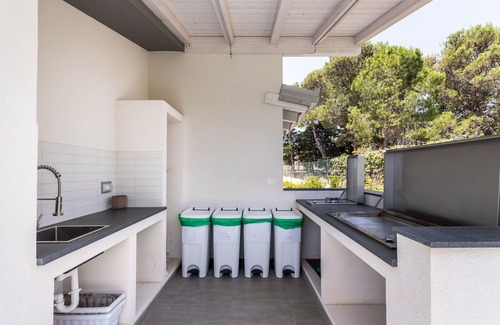 Kitchen + living room: well equipped kitchen, dining table (people: 6), dishwasher, fridge, freezer, microwave, stove top, oven, iron, italian coffee machine, washing machine, sofa, fireplace, WIFI internet, air conditioning, mosquito net, television, exit to the veranda.