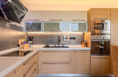 You will be staying in a 4-room apartment that spans across two levels on the 1st floor with a total area of 120 square meters. The living/dining room features a dining table and a TV, and it provides access to the terrace. One room contains a single bed and a double bed measuring 180 cm in width and 200 cm in length. Another room is equipped with a double bed measuring 160 cm in width and 200 cm in length. The open kitchen is well-appointed with an oven, dishwasher, 4 induction hot plates, toaster, kettle, and microwave. There is also a shower room with a bidet and WC. On the lower ground floor, accessible via an exterior staircase, you'll find a large room with a single bed, a double bed, a shower room with a bidet and WC, and a TV. This room opens up to the garden and the swimming pool.