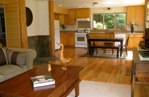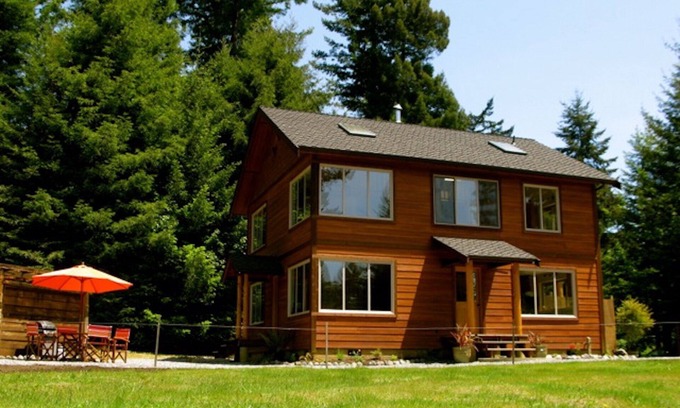 Enjoy a secluded retreat with a hot tub. This contemporary chalet in the Redwoods is bathed in sunlight and is a short stroll to the Mad River and only minutes from HSU and downtown Arcata's local shops, restaurants, grocery stores, and Community Forest.