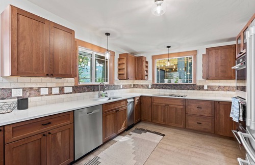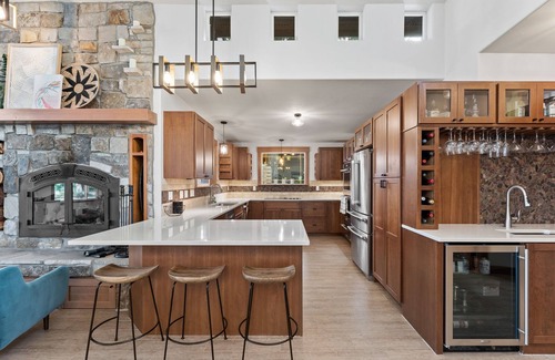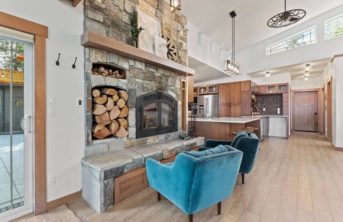 The cabin has three bedrooms, two bathrooms, and an additional Murphy Bed in the living room if needed. The interior is cozy yet chic and boasts a beautiful wood-burning fireplace. The chef's kitchen is fully-stocked and there is a full wet bar as well. There are plenty of board games and puzzles for you to use during your stay! The cabin is available year-round and is equipped with an automatic generator.