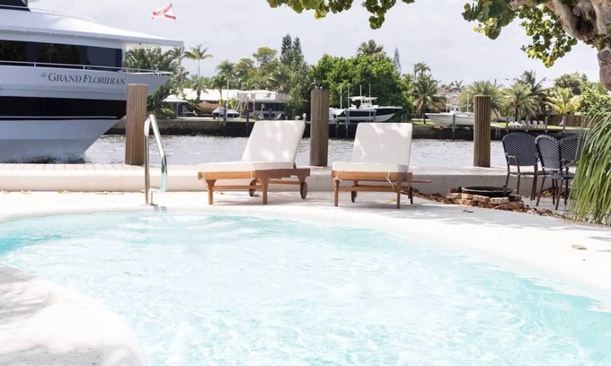 Beautiful condo located directly on the Intercoastal with a heated pool. Enjoy watching the yachts float by from our dock. Quiet and peaceful. Exactly 1 block from the beach and within walking distance to many shops and local amenities! Perfect for couples, young families, and groups of friends traveling together. Watch the sunset and boats by from our pool and patio all with comfortable sitting areas. Private entrance, full kitchen, desk/work area, free wifi, microwave, Keurig, plates and utensils, 4 beach towels, 2 beach chairs, and a beach wagon are also available inside the condo for use during your stay!