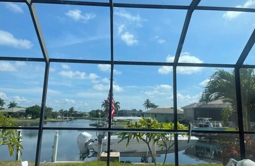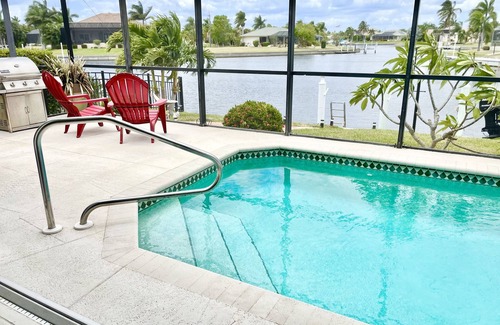 Beautiful open floorplan three-bedroom home with a breathtaking water view. It is located in the lovely Burnt Store Isles community. The home is beautifully decorated with coastal charm. It has a spacious master bedroom with a king bed and ensuite. The lanai area includes a lounger, dining area, heated enclosed pool, and barbecue. This area is great for swimming, sunbathing, grilling, relaxing, or just enjoying the waterfront view. It is conveniently located less than 1.5 miles from a grocery store (Publix), Walgreens, and HomeDepot. It is also close to the downtown area, historical district, and Fisherman's Village.