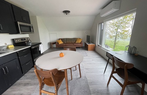 Private, one-bedroom apartment with gorgeous views of the Green Mnts, lush fields and clay plain forests. Native plants and trees attract birds and pollinators. There are roads and walking fields to explore right from the apartment as well as access to safe biking routes. Garage parking in snowy weather and EV charging when requested. Numerous nearby attractions (Sunrise Orchards, Snake Mountain, historic Crown Point, Lake Champlain). We are just a 10 minute drive to Middlebury College (with free access to sporting events) and town full of unique shops, restaurants and galleries. We're happy to host and make your stay a happy one!