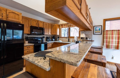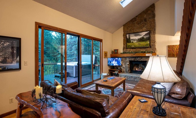 Serenity Cabin is situated along the Big Thompson River at Aspen Brook. Managed by Aspen Brook Vacation Homes with a local property management office, you have the best of both worlds - stay super close to Rocky Mountain National Park, but have the convenience of being just minutes from the downtown village. Aspen Brook is a small community of vacation homes only 2.5 miles from downtown Estes Park and so close to the national park you can walk from your vacation home. Serenity has four spacious bedrooms, two living areas both with natural gas fireplaces, Flat screen Smart Samsung TV's and plenty of space for everyone. Central Air-conditioning and new natural gas furnace. So comfy, you'll be tempted to never leave! Relax in the new deck furniture facing the river and star gaze. With no streetlights, the dark skies make stargazing spectacular. The wonderful salt-water hot tub is on the river facing deck and is a great way to wind down after hiking the park all day!