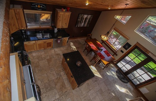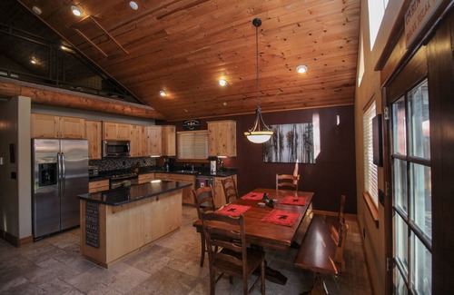The rustic-yet-modern kitchen has beautifully crafted Alder wood cabinetry and sleek black granite counter tops. With stylish stainless steel appliances and all of the accouterments, this chef's kitchen is a joy to cook in. With dining area seating for 8, the group can enjoy a wonderful meal together in this open and comfortable space.