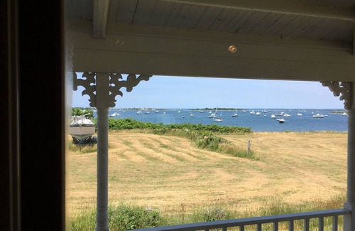 This updated 2 story farmhouse-style home features 4 upstairs bedrooms, all with Queen beds and memory foam mattresses. An additional downstairs living/bedroom features original built-in bookcases and a queen-size sleeper sofa. The house includes 2 full bathrooms, 2 living rooms, a full kitchen with dishwasher, cable tv, and clothing washer and dryer. A two-side wraparound porch offers stunning views of both New Harbor and the Atlantic Ocean. Just steps from State Beach and Scotch Beach, the house is only a mile and a half from the shops, restaurants, bars, and ferry port of Old Harbor. Rental fee includes all bedding, bath towels, and beach towels. During the months of July-September, this property rents from Saturday to Saturday (shorter stays will be considered but dates must fall between Saturdays.)