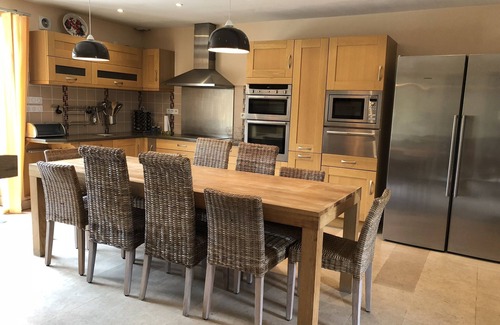 In the very large sitting room, which is open to the beamed roof above and with a galleried landing around, is plenty of space for relaxing and, in the colder months, enjoying the lovely open log fire. In the mezzanine gallery above, is an additional relaxing area with TV/Wii, a DVD/video player and PlayStation 4. The very large garden and terrace with large heated swimming pool (open for use mid-May through to mid-October), is perfect for enjoying a barbecue and relaxing in total calm, or for watching the children playing on the climbing frame/swing set.