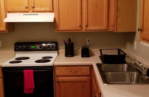 This home has two stories. The main level has all of your common areas such as a family room, fully equipped kitchen (Keurig, pots, pans, mixing bowls, dishes, utensils, microwave, toaster, and toaster oven, etc.) and dining room. The family room has a flat screen Smart TV with complimentary Netflix and local channels. The home is located in a quiet cul-de-sac and has a large fenced-in backyard.