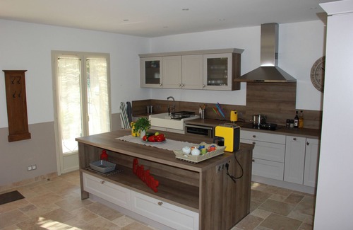 There is plenty of space on the open plan ground floor, with a luxurious dining area with all that you would need for a special meal. Close by is the sitting area with 2 comfortable sofas and an arm chair, a coffee table and large TV (UK & French freeview channels).