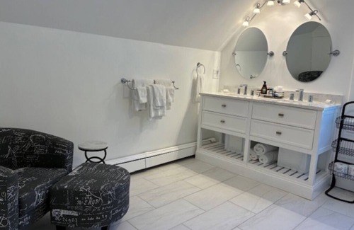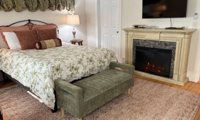 The North Haven Suite is named after one of the nearby islands in Penobscot Bay where Rockport Harbor is located. This second Level Queen bedroom is accessed by the front entrance staircase. The room opens to skylights, luxury bedding, elegant decorations, romantic electric fireplace, flat screen smart TV, spacious walk in closet, and air conditioner unit. The connected en-suite bathroom overlooks the courtyard gardens and has a double vanity and full bathtub/shower. Access to the lower level of the house is restricted (unless the whole house is reserved), but North Haven Suite guests are welcome to use the firepit in the backyard. Access to adjacent lodge outdoor heated pool (open seasonally), and guest BBQ, firepit and gardens is also included plus free morning coffee in the lodge office. Entry is through Inn front door and parking is on grassy knoll alongside driveway. No smoking in or on this property. No dogs allowed in North Haven Suite. Check in at Starlight Lodge Office. 2 night minimum/$50 cleaning fee.