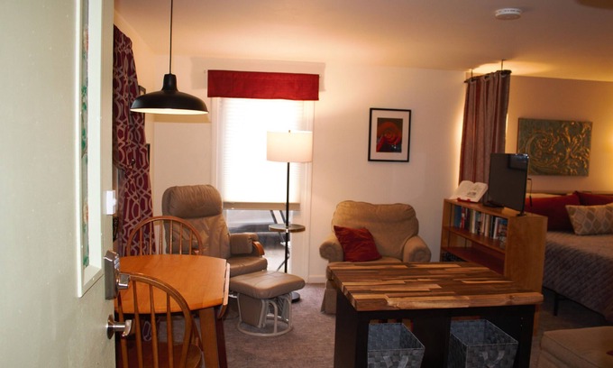 Designed with the traveling professional in mind, The Studio has a semi-private entrance through a shared (with the hosts) vestibule. Your entry has a keyless digital security lock. You'll step in to small entry that has a bench to sit and remove dirty boots or shoes and hooks to hang jackets or sweaters. Ahead you see a beautifully furnished living / eating area with two comfy reading / relaxing chairs, smart TV, lamps, and decor items that make it feel homey. Not fussy, but welcoming. You have a dining table and two chairs with additional folding chairs available to borrow if needed.
